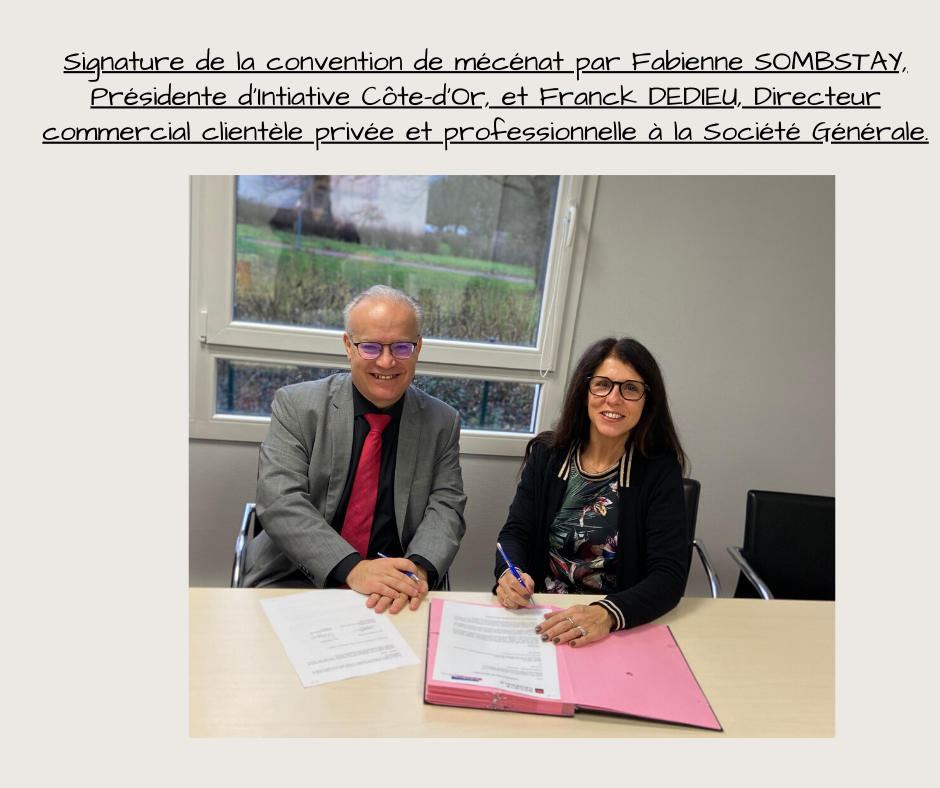Signature de la convention de mécénat par Fabienne SOMBSTAY, Présidente d'Intiative Côte-d'Or, et Franck DEDIEU, Directeur commercial clientèle privée et professionnelle à la Société Générale.